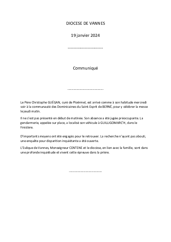 Communiqué du diocèse concernant le Père Christophe GUÉGAN